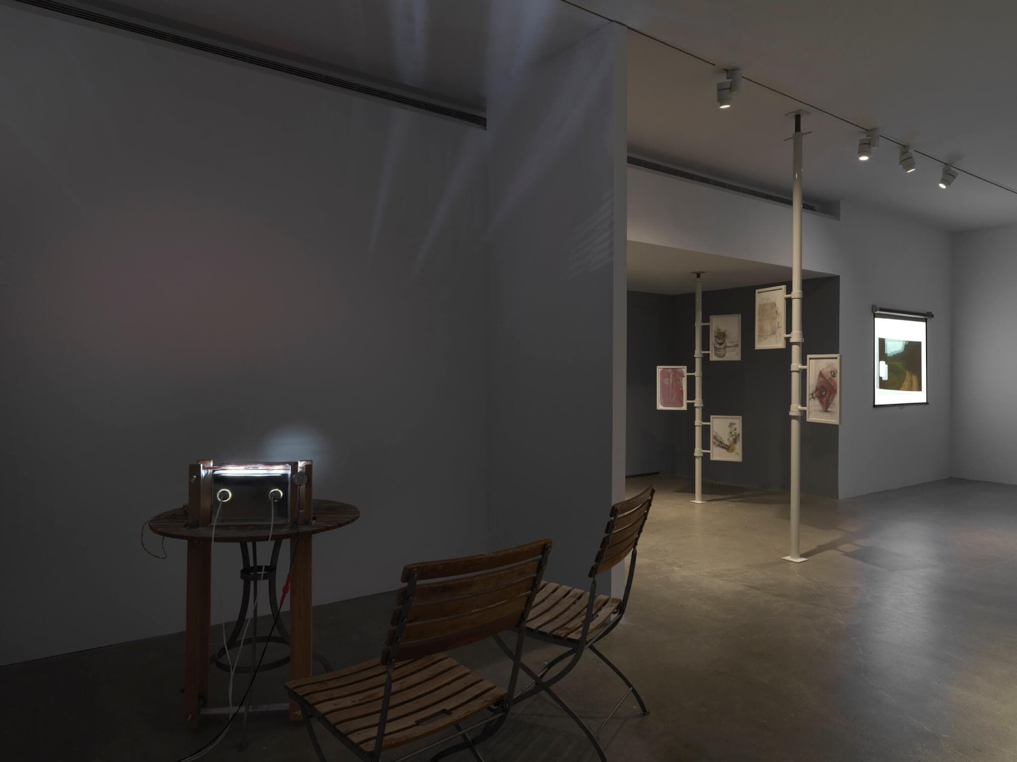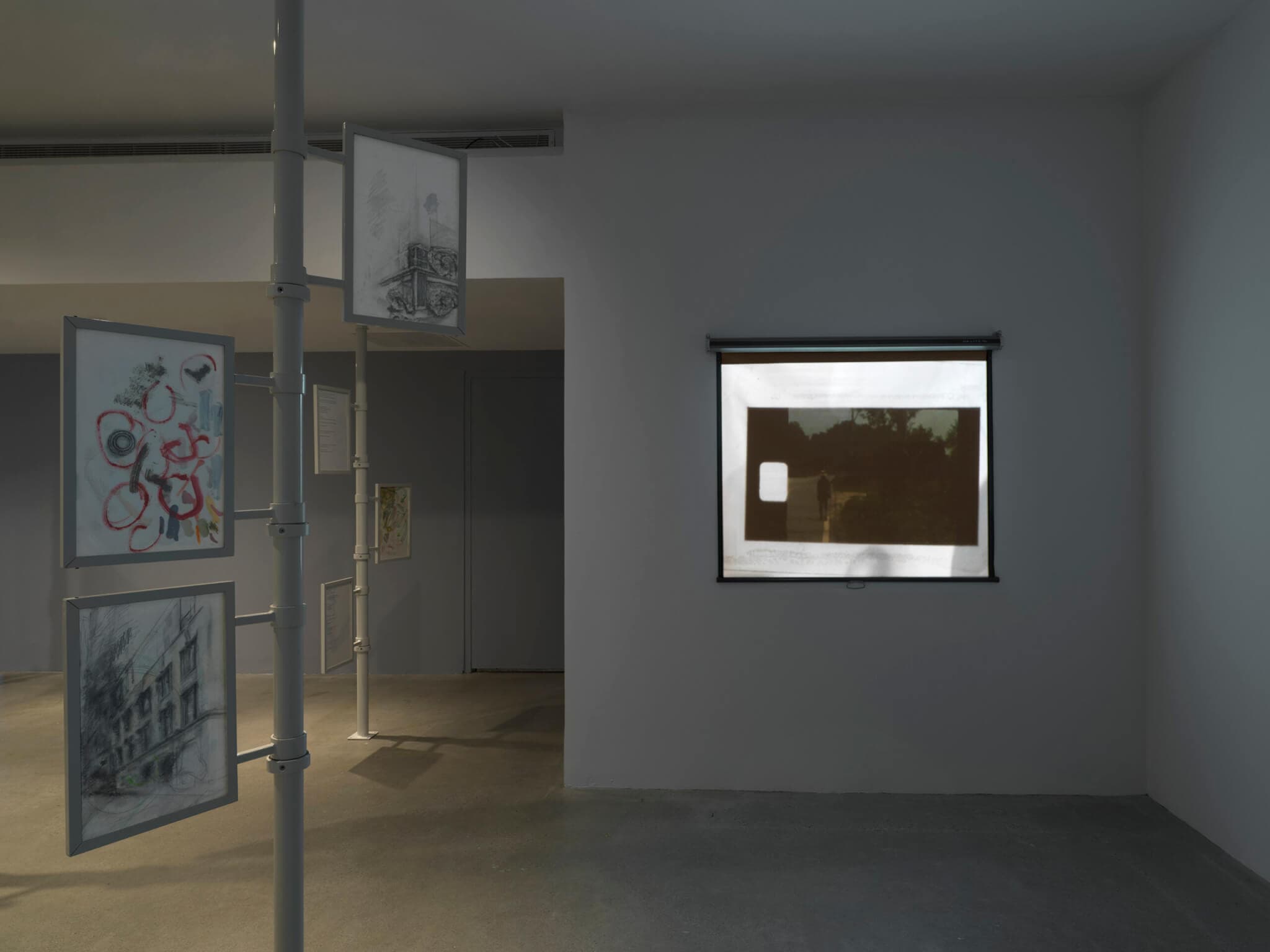 “List Projects 28” presents two expanded cinema pieces as well as thirty-two mixed-media drawings that are installed flag-like across five floor-to-ceiling poles. The two sets of drawings—half belong to Shin and half to Friedman-Pappas—are framed back-to-back in a display structure that is evocative of didactic signage, and can be easily repositioned by viewers.