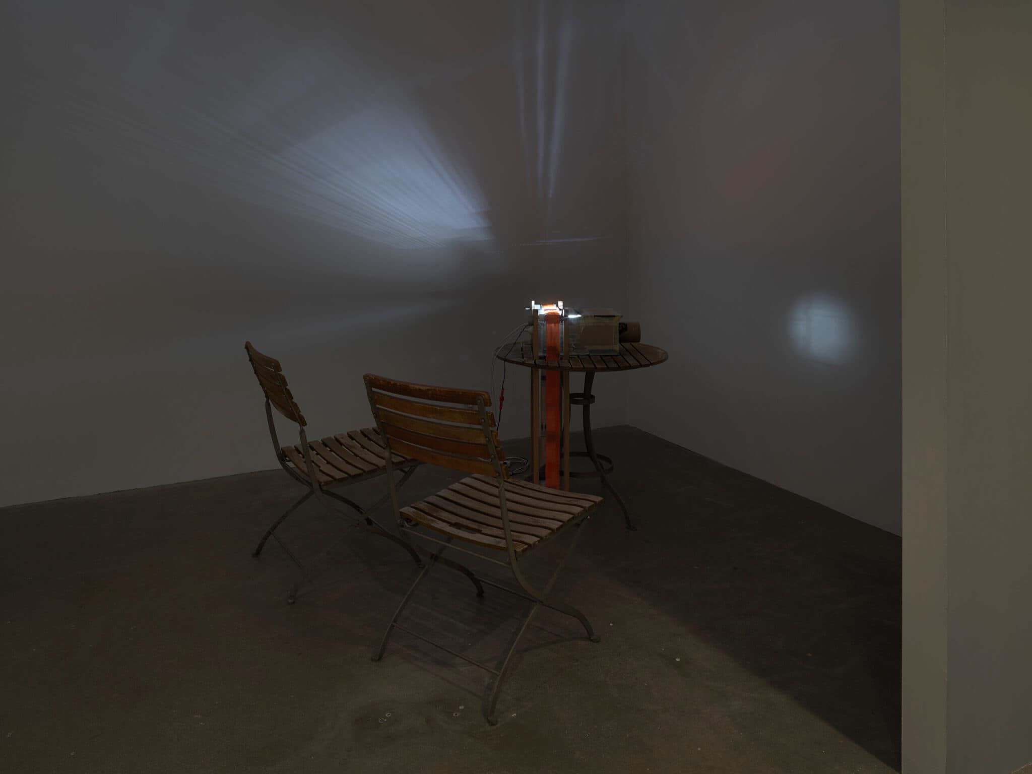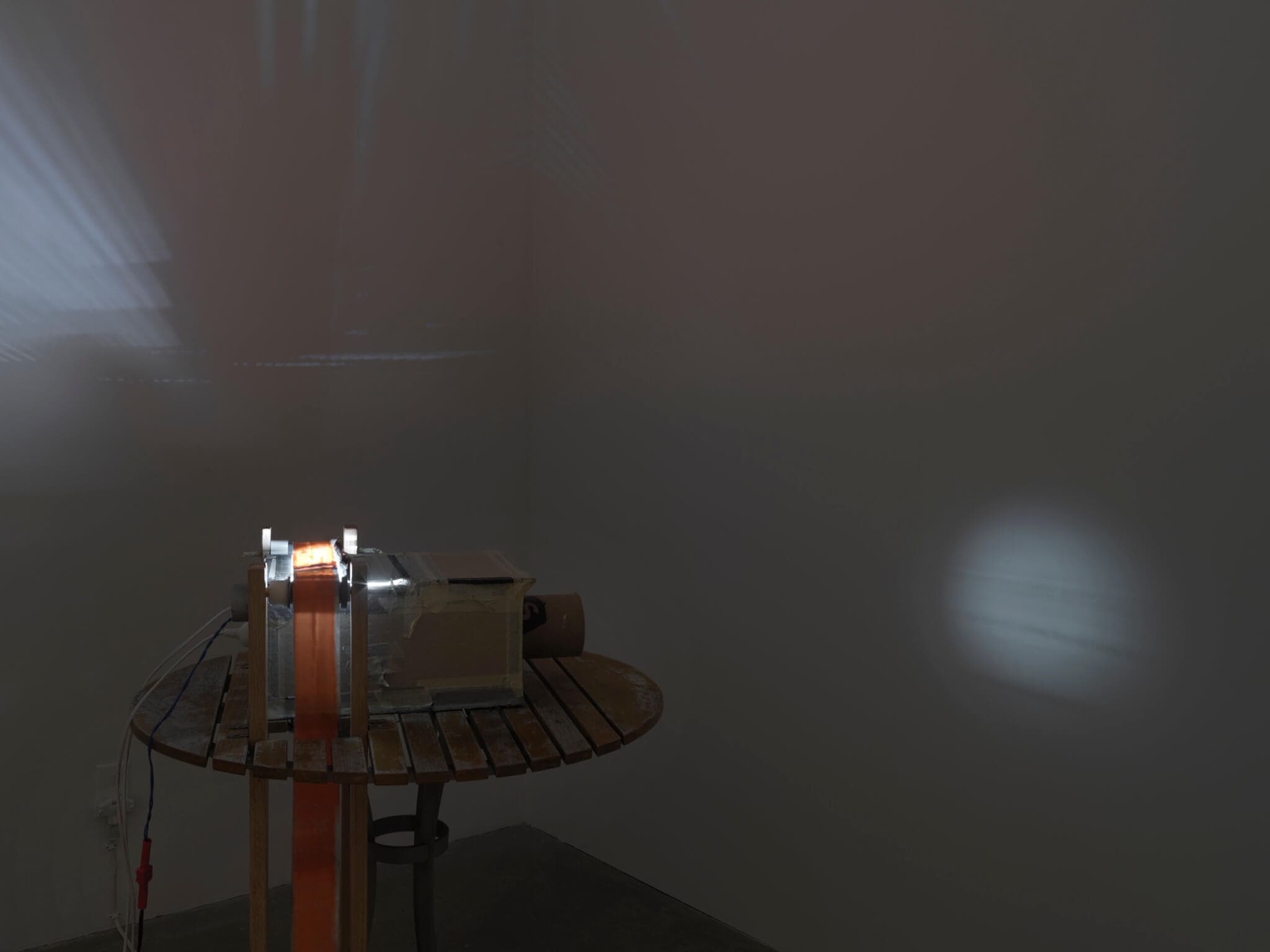 Sophie Friedman-Pappas, Deltille-d Wall’s Necessary Anachronism 2, 2023. Inverted camera obscura (homemade projector), mixed media, table, folding chairs; 10 min. Courtesy the artist.