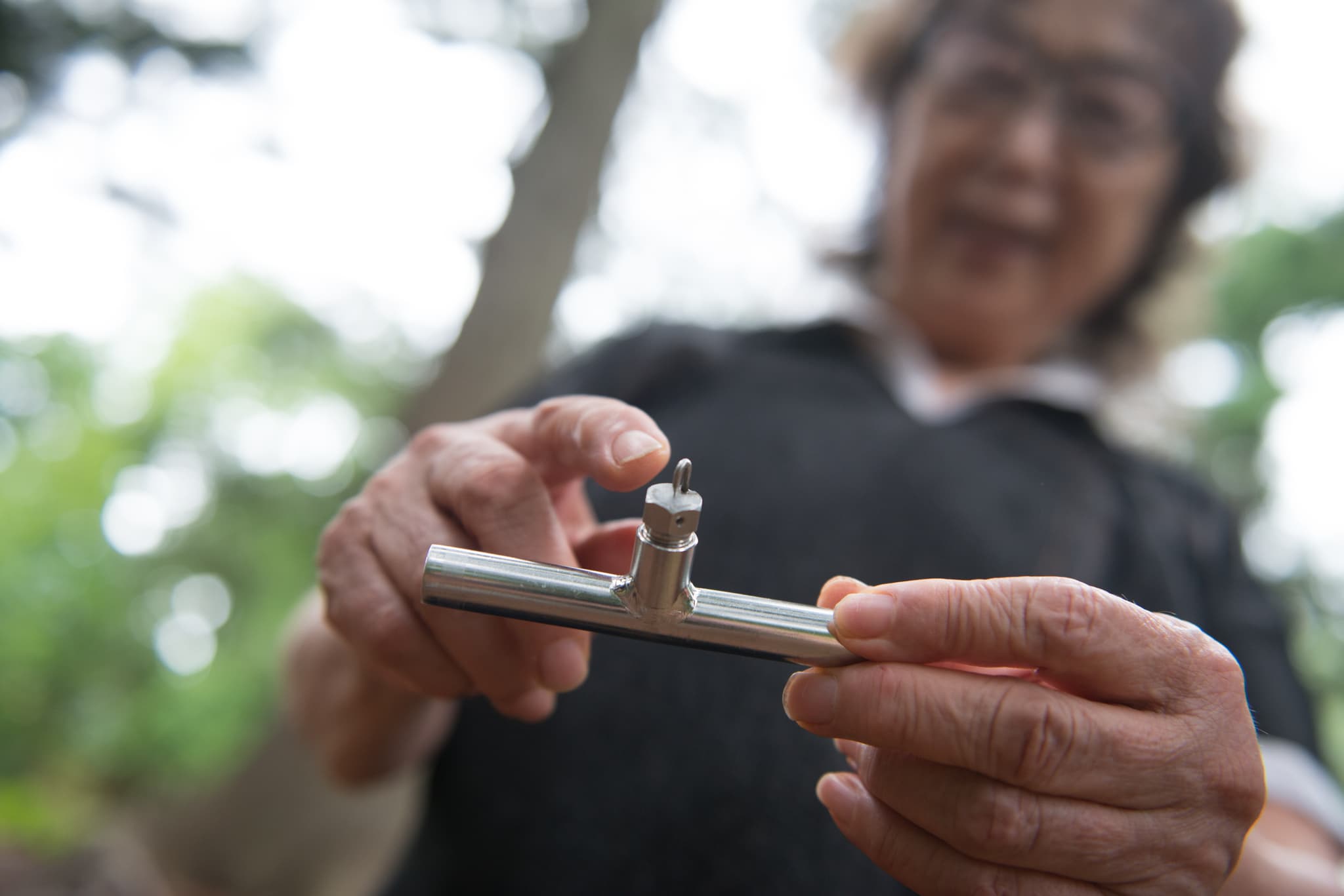 Fujiko Nakaya and fog nozzle, Arnold Arboretum, Boston, 2018. Image by Melissa Ostrow courtesy of Emerald Necklace Conservancy.