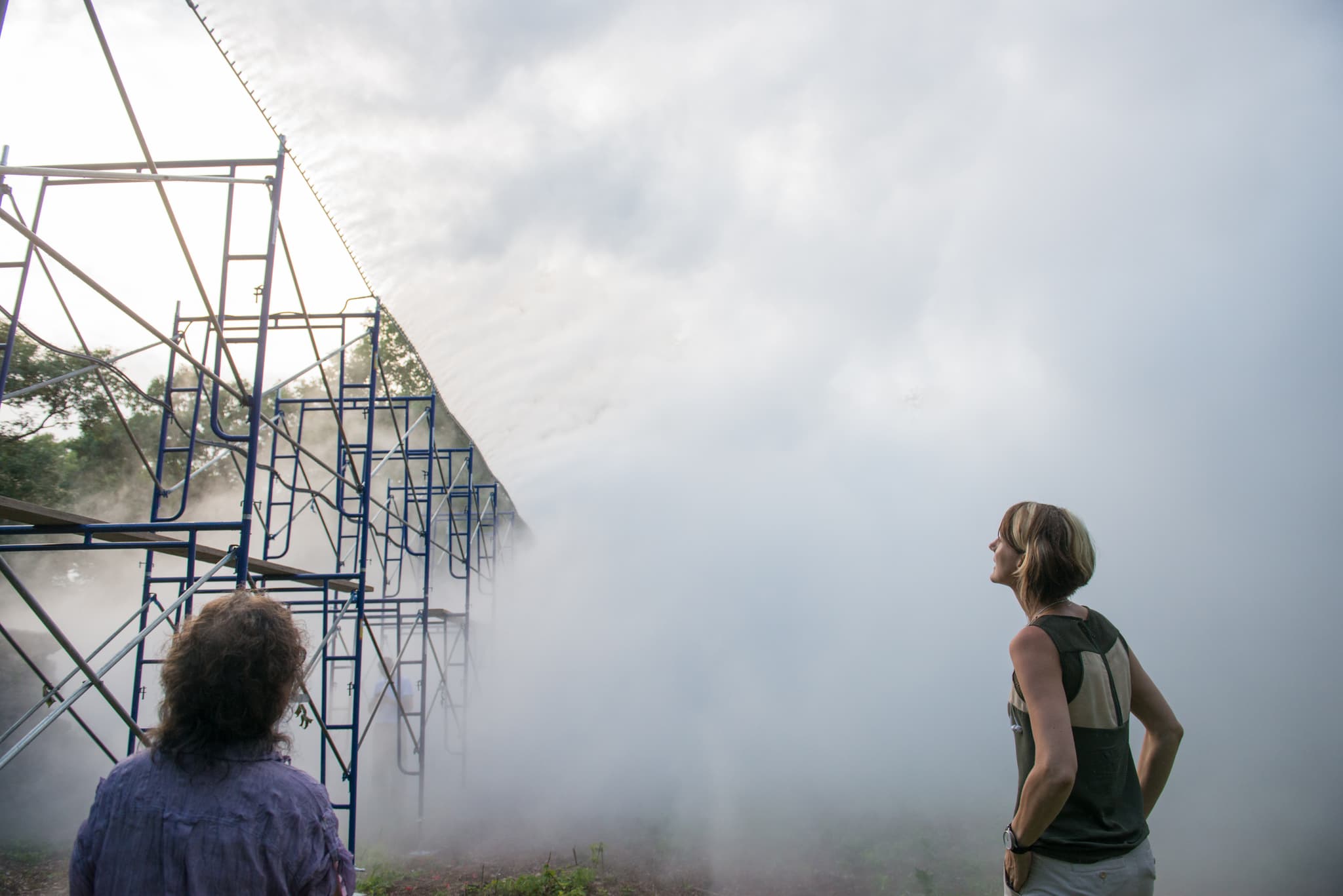 Fujiko Nakaya, with Jen Mergel, testing her fog sculpture Fog x Ruins in Franklin Park, Boston, 2018. Image by Melissa Ostrow. Courtesy of the Emerald Necklace Conservancy.