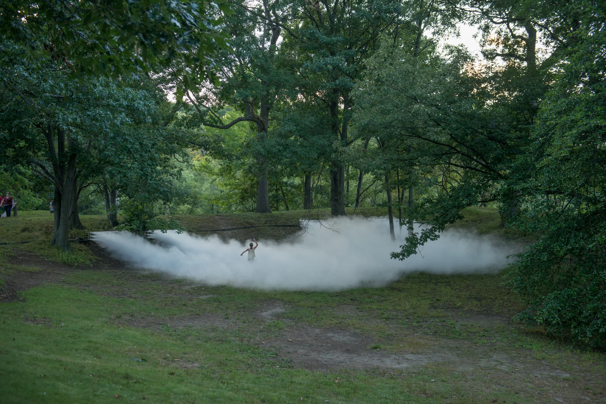 Fujiko Nakaya testing her fog sculpture Fog x Ruins in Franklin Park, Boston, 2018. Image by Melissa Ostrow. Courtesy of the Emerald Necklace Conservancy.