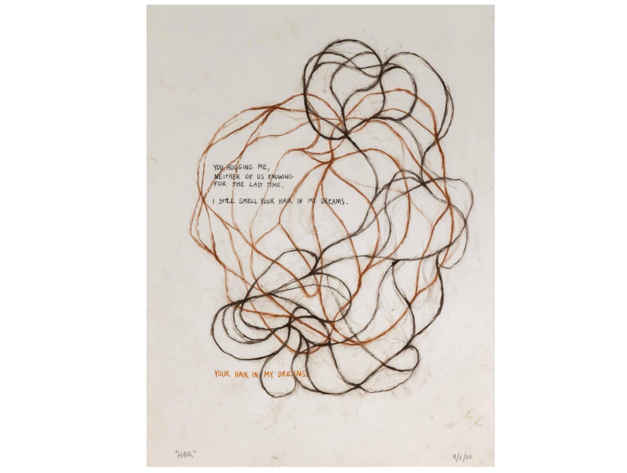 Peter Bruun, Hair, 2020. Charcoal & pastel with ink writing, 11 x 15 inches. Courtesy of the artist and the University of Southern Maine Art Gallery.